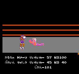 This is also the first fighter with throws and grappling. The fighting system is enjoyable, but definitely not conventional and takes some getting used to as a result. The player first has to approach the opponent and then, after initiating a grapple, tap a direction together with one of two buttons. One of the two executes an attack or changes the character's positions. The second button is for jumping or, while in a grapple, performing throws. Throws are generally only possible when Yuki's opponent has no health left, but they are the only way to win a match. When opponents are crawling away after a defeat in the indoor levels, Yuki can kick them in the butt for extra points.