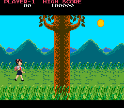 While Yie Ar Kung-Fu's mechanics owe a fair share to Karate Champ, its innovations lie in a different field: Generic Karate Guy 1 and Generic Karate Guy 2 were the stars of almost every fighting game at the time, but Yie Ar Kung-Fu features a colorful cast of characters that look like it was ripped straight from a boisterous 1970s Hong Kong flick, each of them with individual characteristics and abilities. The duels are accompanied by the most stereotypical tunes of "Chinese music" one could imagine. The player always plays the role of Oolong, who is out for revenge after his father has been killed by the tournament champion in the final battle. Character select screens were still a thing of the future, matches for two human players the privilege of Generic Karate Guys in other games.