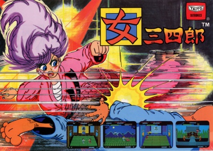 Typhoon Gal is the first fighting game with a female playable character. It still won't make feminists happy, though: The heroine Yuki is clad in a "girlish" pink gi, and starts crying when she is defeated. And even though her general design is not sexualized, she is seen hiding behind a tree to change into her fighting gear, throwing her clothes to the wayside.
