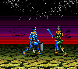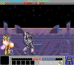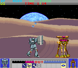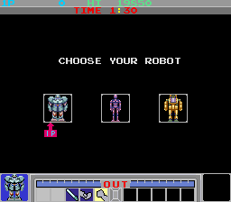 There are three playable characters: Samson, A mid-sized robot with a sword; Gaea, a "female" robot with breast projectiles(!); and Poseidon, a bulky robot with an extendible limb. All of the characters move slowly and rebound off each other when they make contact. It seems Konami wanted to make the battling robots feel more real with these features, but they just make the movement awkward. The game uses three buttons. Inspired by Sega's Champion Boxing, one cycles through three different kinds of attacks: a punch, a kick, and a third attack unique to the character. This switch system isn't very intuitive and the game would be much more playable if it just had three separate attack buttons. The second button executes the currently selected attack. The last button raises the characters' shields to block.