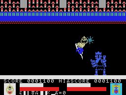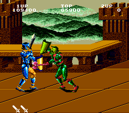 Each discipline can be practiced individually, to prepare for the main mode, where the game alternates between the three. The fights take place in scrolling stages, where new enemies keep appearing one at a time. They range from ninjas to skeleton warriors and some nasty gnomes, who can turn into ghosts and are really hard to hit in either form. The pole fighting scene is very obviously inspired by the scene in The Adventures of Robin Hood with Errol Flynn - it even takes place on a tree trunk above a river.