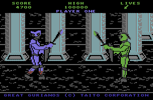 Gladiator got ported to the Commodore 64, Amstrad CPC and ZX Spectrum, under the European name Great Gurianos, only released on compilations and through a low budget label. Neither of them is very good, chiefly because the player is stuck with either keyboard controls or a really inconvenient joystick scheme that requires the function keys on the keyboard to control the sword. But the hit detection is also bad, and instead of losing armor characters simply turn red at damaged parts. The Spectrum and Amstrad versions notably were programmed by one David Perry of later Shiny Entertainment fame, who hilariously made the final boss invincible because there was no memory space for the ending left.