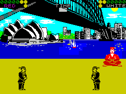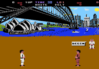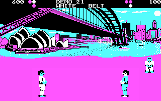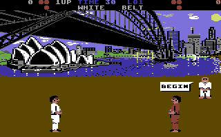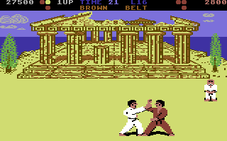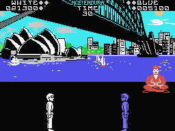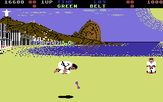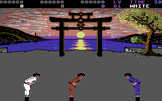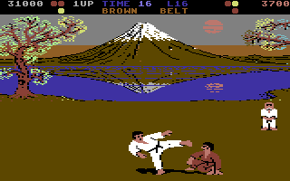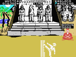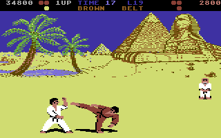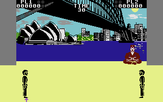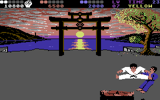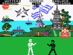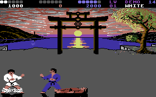 There are hardly any differences between this game and Exploding Fist, at all. They both have the exact same gameplay. Even the fighters look like redrawings of the exact same sprites. The only obvious feature to distinguish International Karate from its forebear are the backgrounds, which take players to famous locations all over the world, true to the game's title. All the big fighting game series revolve around ominous international martial arts tournaments, be it Street Fighter, The King of Fighters, Virtua Fighter or Tekken, and this is where the trend started. There are a total of eight different backgrounds, compared to Exploding Fist's four. The music was composed by Rob Hubbard, a very popular composer among C64 music fans. He was later responsible for the music in Bangkok Knights, Budokan, Skate or Die, and Road Rash.