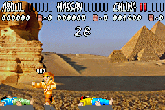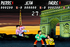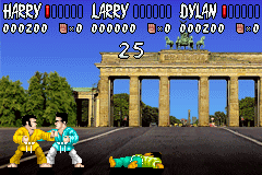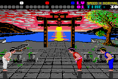 A year later arrived International Karate Advanced. The gameplay is mostly the same as the GBC predecessor, but it uses the three-combatants mode from IK+. The backgrounds look like their elements were cut out from photos, and they really don't mesh well with the charactrer sprites.