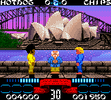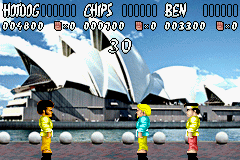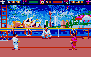 The Atari ST version could almost be considered a remake. It looks way more high end, but replaces the original aesthetics with a more cartoonish look. Not only do the characters have extraordinarily pronounced ears and noses, they also have a few different goofy reactions depending on what part of the body they're hit. All previously existing graphics are redrawn, some backgrounds are merged together to make way for a couple new ones, amounting to a total 10 stages. Some have even added spectators, like the royal guard in London or topless dancers in Hawaii.