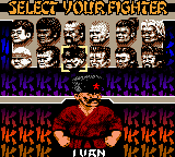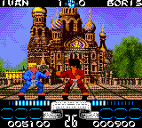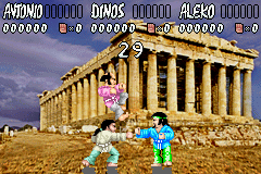 International Karate 2000 for the Game Boy Color port is a complete reimagening of the original, with very different gameply. The best improvement is that the characters face each other at all times, removing the problem of moves that turn them around. Attacks are still executed by tapping a direction and a button at the same time, but are performed slightly differently. Another change is the addition of a health bar. Getting in a hit after the health bar is depleted results in a knock down, which can be worth a half point or a whole point. The first player to score three points wins the round. There are now 12 characters with individual heads and gi colors, but as far as the gameplay is concerned, they're still all essentially the same guy.