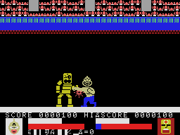 Kinnikuman Colosseum Deathmatch is based on a manga/anime franchise that is mostly known in the West for a line of toys called "M.U.S.C.L.E.". The first video game based on Kinnikuman is a fighter for MSX where a single player must fight past three opponents, after which the game loops. Matches consist of only one round, health is measured with a health bar, up jumps, down ducks, and it's possible to attack from those positions or while standing, and execute a throw. There's also a bizarre, and far too risky, technique where you jump against the wall, tap the direction toward the wall and then attack, making the character bounce off the wall; damaging the opponent if the move connects, or hitting the ground and taking damage if it does not. Lastly, the game is noteworthy for being the first fighter with air throws. It seems like this could have been decent, but control responsiveness is poor, and often nothing happens even after repeated presses of a button. Despite this last problem, it's a pretty easy game, so it's definitely worth playing through as a curiosity.