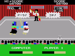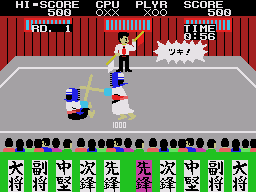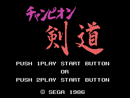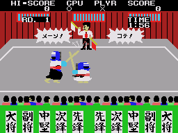 Sega's freshman fighting game is also the first one entirely dedicated to the sport of kendō. Since its exact release date is not known, it might even predate Musashi no Ken. The system is very different from Sega's previous combative sports games, Champion Boxing and Champion Wrestling, with their weird move cycling controls. One button is for blocking and one for attacking, while the directions on the d-pad stand for the typical kendō attack zones: the head, the wrist and the body, alongside a lunging strike. There is no way to control feet movement, instead the combatants keep pacing back and forth automatically. The challenge is to anticipate the best moment to strike from just the right distance. Of course, the actions of the opponent matter, too. In fact, most attacks are just as effective at avoiding hits as the defensive stances, rendering the latter mostly useless. In general not much happens over a long time, as it's near impossible to properly anticipate the opponent's moves, even though they are announced by speech bubbles just before the attack.