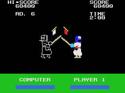 The control responsiveness is good and attacks are fast, so it's easy switch from a block to a strike very quickly, and vise versa, making precise timing an important part of gameplay. Combatants can't jump over the opponent though, which makes cornering far too easy, and makes the ducking block an impenetrable form of defense. While not the worst fighter by any means, matches are mostly spent just hacking away.