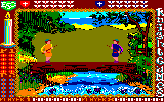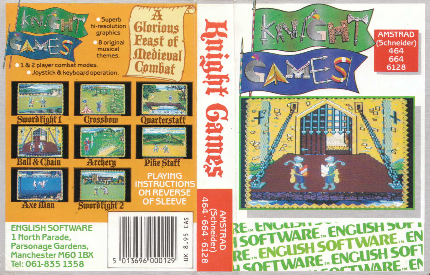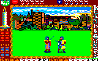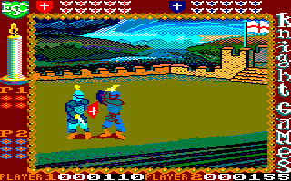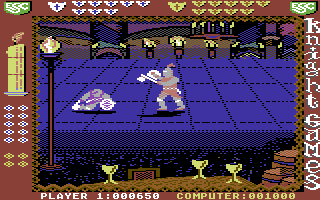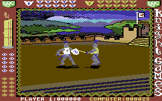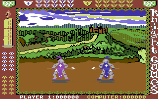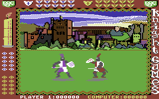 English Software's second offering in the fighting genre was much more widely known than Chop Suey, but that's definitely not thanks to the quality of the game. English Software tried to pass it off as a multi event sports kind of game, but that's mostly facade. Six of the eight disciplines are the same fighting game with different weapons and apparently different moves. The categories are called "Swordfight 1" and "2", "Quarterstaff", "Pikestaff", "Ball & Chain" and "Axeman", but it's all just two knights hacking away at each other without rhyme or reason by pressing the four cardinal directions of the joystick. The fire button allows to back away a little, but that doesn't save the game from being a mindless button masher. The fights take ungodly long, too. It takes depleting of two life stocks to knock down a knight, and when he is defeated, another warps into the battlefield. Only after four more knights, the battle is actually won and you can enter a high score before being dropped back onto the weapon selection screen.