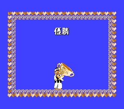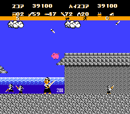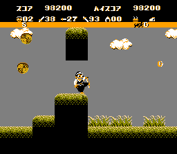Musashi no Ken, based on the manga of the same name, is an odd hybrid: The game starts with a series of platforming stages, where the hero has to get to the end of the stage before his dog at the lower end of the screen does so. The controls here are stiff and infuriating, especially in the later stages full of bottomless pits. Throughout the platforming part, there are sword icons to collect, which point in three different directions. They're useless here, though, and only get important for the fighting game part.