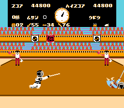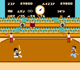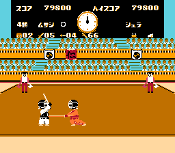 When the three platforming stages are overcome, the little hero Musashi takes part in a kendō tournament. The aim here is to hit the opponent three times with either frontal, upwards or downwards attacks. One button in combination with the directional pad is for normal moves, while the other executes special strong slashes. Every use of them depletes ten units of the corresponding sword icon, so technically this is the first fighting game with a special move meter, although of course it works very differently than in modern fighting games.