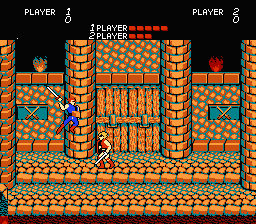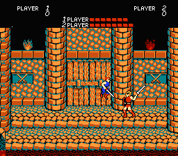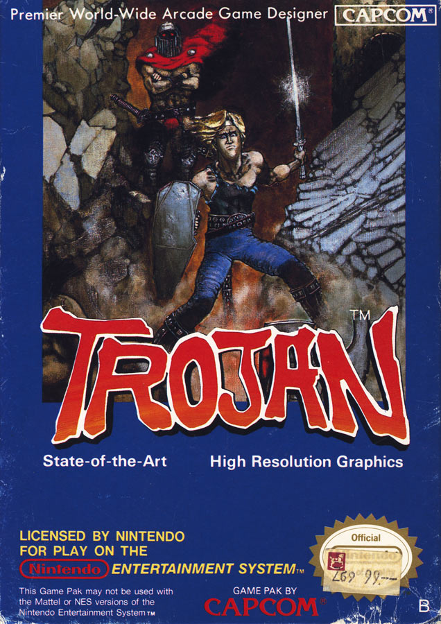 When the Capcom action game Trojan was ported to NES from the arcades, it got a versus mode that plays like a fighter and remains exclusive to this version. As this port was made in 1986, that technically makes it Capcom's first foray into the fighting genre. Both players control the playable character from the action game mode, and only two player fights are available. Matches are fought in a best-of-five format. Health is measured with a health meter comprised of several notches, and a single notch is depleted with each hit. Down ducks, Up jumps, and there is a block button that causes the character to block with a shield. The only attack is a single sword strike, but it's possible to attack or block while airborne or ducking. There are separate hit zones, which allow for mix-ups, and with correct timing it is even possible to hit air blocking opponents in the feet.