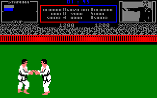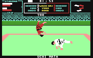 Uchi Mata is the first fighting game to have Street Fighter-style controller motions. At first the two combatants grab each other, upon which each of them is assigned a Grip rating, depending on their distance and the timing of the button presses. Then both try to throw the opponent by pressing the fire button again and quickly putting in the joystick (or keyboard for the second player on Amstrad and Spectrum) movements. The moves range from simple Hadoken-like movements to much more complex combinations, but the time frame for this is so tight, they have to be put in with insane speed and precision. And since the actions of the other fighter hamper with the execution, they're really hard to get right. The CPU is almost impossible to beat properly - it's much easier to get it to perform one too many illegal moves and have the opponent disqualified.