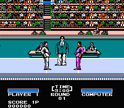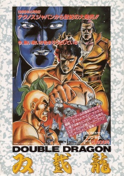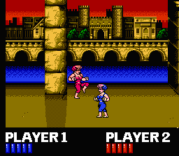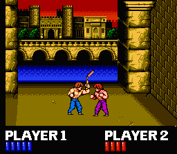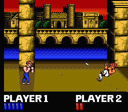 After Double Dragon's 1987 release in arcades, it was ported to the NES in modified form in 1988. This version lacked the option of playing the beat-em-up with two players at the same time. In a attempt to make up for this, a two player fighting mode was made available exclusively for this version. Choosing Mode B at the title screen leads to a selection of six characters from the game to choose from. Strangely, it is only possible to fight mirror matches, regardless of how many people are playing. There is no jumping, and the character specific move sets are small (A punches, B kicks, A & B jumpkicks, except for Abobo, who lacks the jumpkick), but they are adequate. When playing as Will, Rowper or Chin in two player mode, there is a weapon on the ground that can be picked up to fight with it, a knife, billy club, or nunchuks, respectively.
