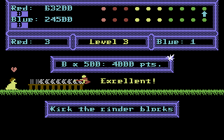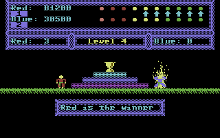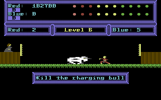 On first glance, Head to Head Karate might seem a little misplaced in a genre overview like this. It wasn't even released commercially, but apparently contained on some disk mag by Softdisk Publishing. Superficially it's also just a bad Karate Champ clone, even though it cunningly replaces the karateka in the white gi by a blue one. (The other colorful fighters from the title screen never appear in the game.) The bonus rounds after each match are also ripped straight from Karate Champ.