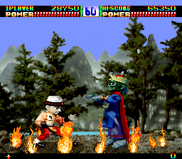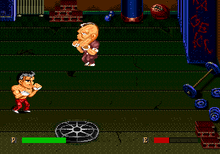 Tapping forward or back twice starts a dashing maneuver, making this the first fighting game to include that technique. This is definitely a great innovation, but here it isn't well executed. Computer opponents have more health than the player, and it's disappointing that different characters cannot be pitted against each other. Control responsiveness, game physics, and the general feel of the game are exactly like the beat-em-up mode, even though it uses larger sprites. It's even still possible to move toward and away from the screen like in a beat-em-up.