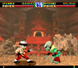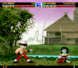 Contrary to the unique look, the gameplay is completely generic. There are three buttons: Kick, Punch, and Jump. Simple stuff. The game offers no interesting mechanics, except for the ability to attack multiple times while airborne. A stork releases health items and hazards every once in a while. A similar feature would be seen in Samurai Shodown several years later.