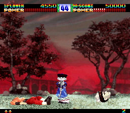 There are two problems with this game: While the controls and physics are decent enough, the hit detection is something of a problem. It's pretty much a guessing game whether or not an attack will hit the opponent from any given position. The game is also inexcusably difficult. Opponent's attacks are much more devastating than the main character's, and opponents don't ever die easily, which is a big pain. Even after their health meter is depleted, it can take several more hits to achieve a victory.