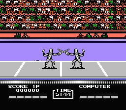 This is a multi-event sports game, but it has a fencing game and a taekwondo game that each play like fighting games. The fencing game is like a faster version of Great Swordsman, but height of attacks are controlled with the directional pad. The second button executes a block. This is a pretty good game, but not as good as Great Swordsman. The best feature that sets it apart from the earlier arcade game is simultaneous two player competition.