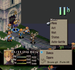 Equipment works more like it does in Tactics Ogre – there’s no defensive stat, as armor simply increases HP and shields increase the probability of defending. There are also a few additional statistics, as each unit has a Zodiac symbol based on their birthday; each symbol either compares favorably or unfavorable to others, which can determine the effectiveness of status effects and other things. There are also Brave and Faith values; Brave determines the probability of triggering “reaction” abilities (what a unit will do after they’re attacked or under certain other circumstances) while Faith determines the strength of magic and magic defense, as well as the success rate of other spells. There are various ways to raise or lower these abilities, though these can cause issues – if the Brave value gets too low, the unit turns into a “chicken” and is unable to fight; if the Faith value gets too high, then the unit decides to leave the party to follow its own religious pursuits. Also added are weather effects (randomized based on the time of the in-game year for non-story battles), as well as day/night encounters, which modify things like evade rates and certain magic spell abilities. Altogether, the usage of these elements are so minor, however, that they can be safely ignored if they seem too complex, though expert players will find extra layers of strategy to take advantage of.