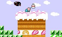 Players fight off a ship which is firing missiles at them, while birds fly in the sky flapping their wings, blissfully unaware of the war raging down below. The game uses multiple visual effects to try to achieve a pseudo-3D look: parallax scrolling (parts of the background move by at different speeds), numerous different sprites to represent the enemy ship at different distances, and layered “lines” of moving water.