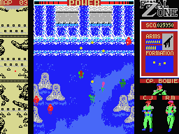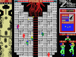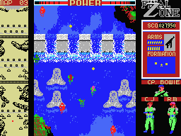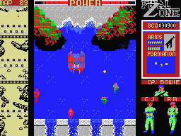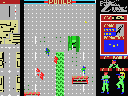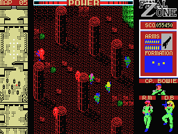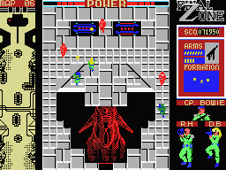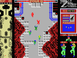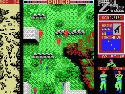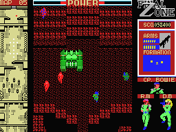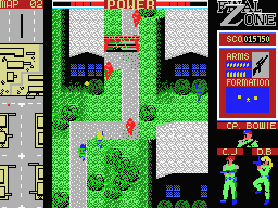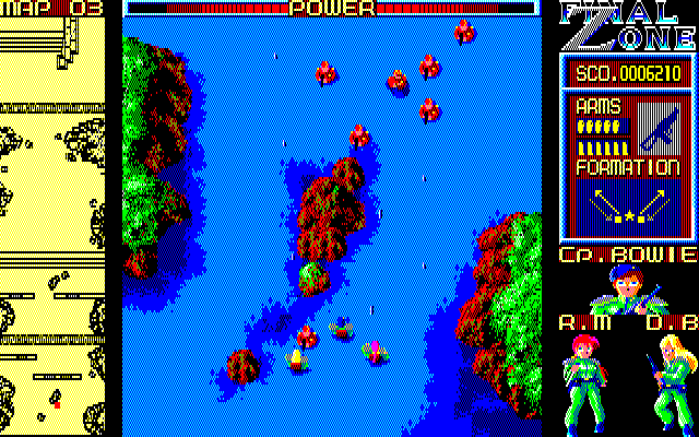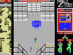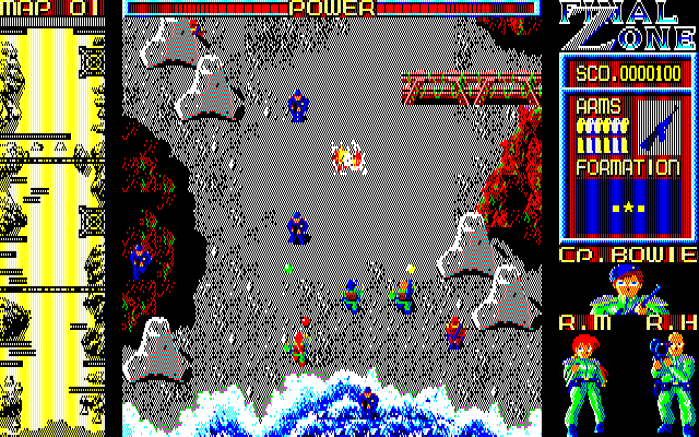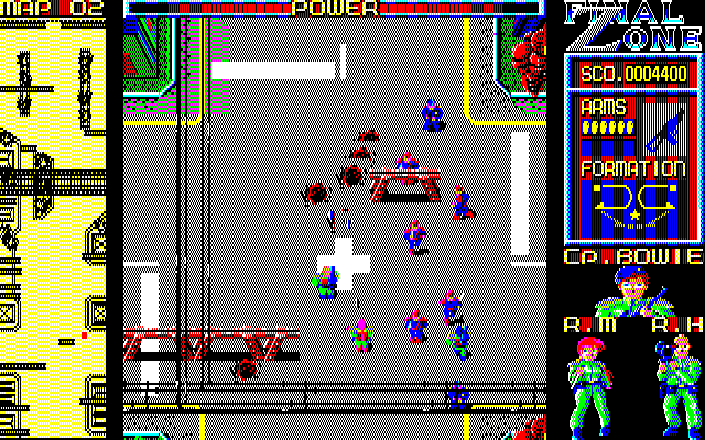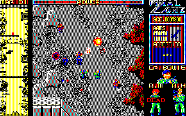 While the squad consists of five characters, the player is always in control of the leader, Harward Bowie. Before each stage, however, two of the others can be picked as sidekicks. This is when things get interesting – and then fall apart immediately. Telenet later became synonymous with “decent but not great and somewhat flawed games,” but Final Zone is different. It’s absolutely horrible. The plan was to offer the player a never before seen depth of tactical play, by allowing to determine the formation of the squadmates. Complex-looking schematics to the right show the current movement pattern, which can be cycled through by the press of a key. The only problem is: It doesn’t work. Mass Effect players who ended up shooting their companions in the back more than the enemies in the face know that squadmate AI still was a troubled issue twenty years later. In Final Zone, their movement is always related to the player’s position, but it’s near impossible to coordinate their positioning at the rapid pace, and they just end up getting killed quickly – if you’re lucky. The just as often get stuck in the scenery, making it impossible to go on.