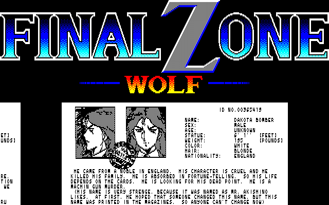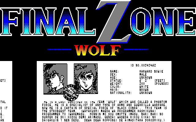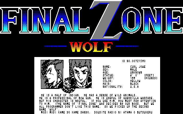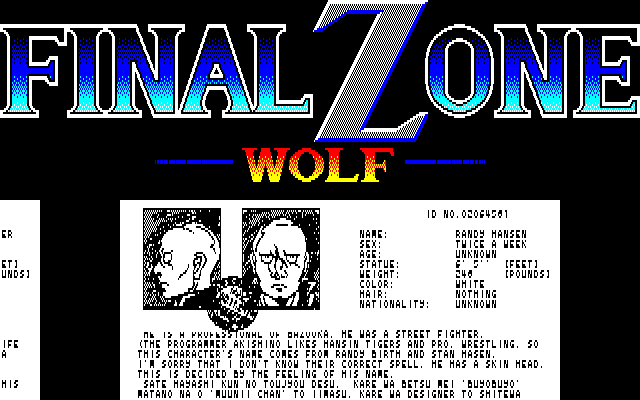 Final Zone is an overhead run-n-gun action game like Capcom’s Commando, but it’s not just that. The program contains an extensive story with lots and lots of dialog between each map. The game tells the story of the special forces team Black Cobra, successor to the legendary Team Wolf (yes, they just did that) on a mission to prevent a devastating missile attack from being launched. Unfortunately, it’s not quite yet to the standard of Wolf Team’s next game Valis with its animated cutscenes, instead all you get to see are the character’s cut-out anime heads, while Japanese text scrolls below. The character introductions are (mostly) in Engrish though, appended with liner notes that give intriguing insight into the development process.