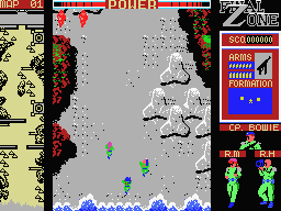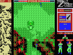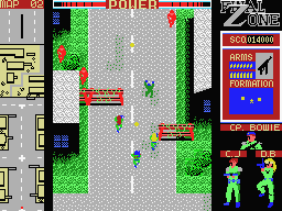 That’s another big problem of the game: There’s no point in fighting, because enemies keep respawning and attacking you from all sides, while Bowie and his companions can only shoot straight up. The endless stream of enemies only turns into a finite one at the end of each map, which like in Commando the year before serves as the stage’s “boss.” The amount of enemies on screen is quite impressive for an 8-bit computer game, but this is bought dearly with a terribly choppy game and ridiculously unresponsive controls.