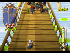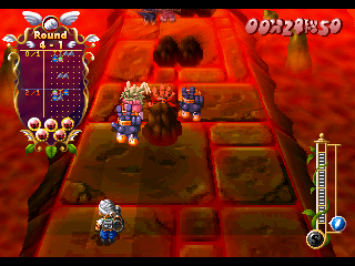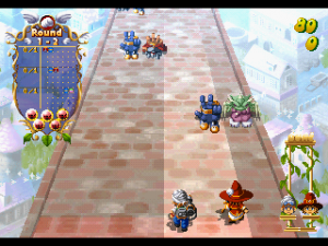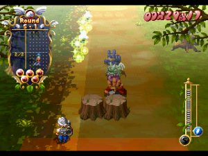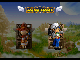 Finger Flashing meshes rocks-paper-scissors with action-puzzle gameplay. You control one of two little wizards, Poi or Cyikke, who march forward against a legion of hand-shaped bad guys. You have three magic spells, each can destroy the associated enemy – the rock spell beats scissors enemies, scissors beat paper, and paper beats rock, of course. In the early stages, the bad guys only attack one at a time, but pretty quickly they start marching next to each other in formations. If you successfully destroy an enemy, then any enemy next to it that can be beaten by that hand sign will also be killed, setting off a combo. For example, kill a scissors enemy, and any paper bad guys next to it will die, and any rock enemies next to that one will explode, and so forth. However, if you use an ineffective spell, you’ll create an extra enemy of that type, making more work for you to deal with. When the pacing heats up, that extra split second really matters! You can also use magic to temporarily stop the enemies in place, giving you an extra moment to breathe, and can also speed up and slow down your marching speed, which determines how many points you get.In addition to a story mode, there are also score attack and time attack modes, plus a two-player co-op mode.