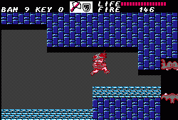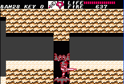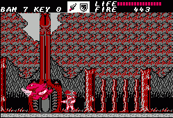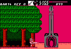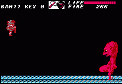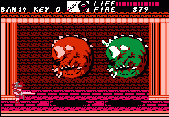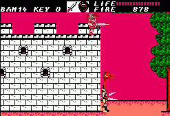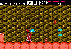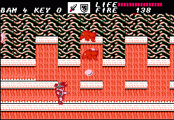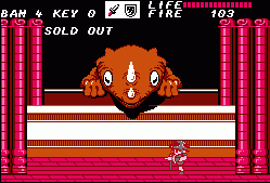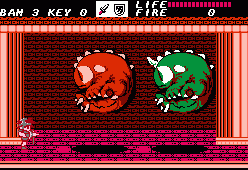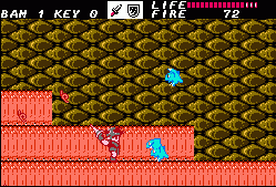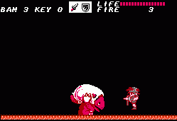 After going through a series of these action sequences you’ll be left with the task of clearing out dungeons. These are entered through the exact same doors, though the dungeons themselves are – obviously – a lot less straightforward. There are dozens of blind paths, elevators going in multiple directions, keys you need to pick up and every place looks pretty much the same. There’s also some difficult jumping sections. Unless you were moving to begin with it’s impossible to induce forward momentum after jumping; it’s unlike Mario, and more akin to Ghosts ‘n Goblins or Castlevania. Jumping from a stationary position results in a useless upwards climb and then descent, which is especially odd, because if you crouch you can perform a rather tall high jump. This means you absolutely HAVE to be running when making a jump. Unfortunately due to the layout of dungeons there are short ledges you need to reach, but because there’s a platform directly above them, you need to perform a precise pixel-perfect running leap in order to avoid the overhanging ledge. Touch the ledge and you fall down, forcing a re-attempt. This kind of easy short jump is common in every platformer, but in Fire Bam it’s elevated to an infuriating new level.