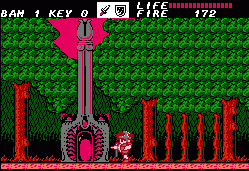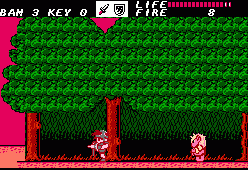 The game stars Bam, who has to regain the Magic Sword, defeat the clan of the “evil Domes” and “open up” the world. This later term has to do with an interesting twist in the game’s mechanics. When you start the game there doesn’t appear to be anything else besides your home town, where you can save your game and regain energy, by visiting what appears to be a pair of mutated lizards right out of Bubble Bobble… these are actually Bam’s parents, whom he is on a quest to save. You then leave for the woods, which serves as a sort of hub area, but with enemies. These range from weird pink bouncing things to humanoid giraffes carrying giant scissors.