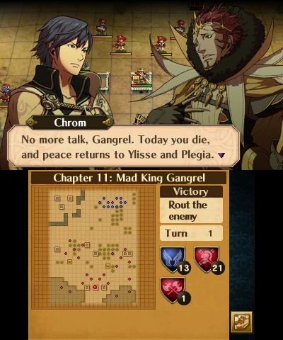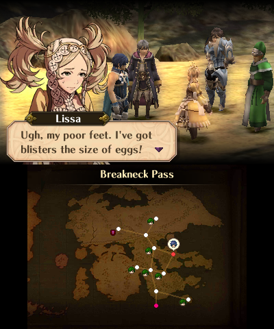 Awakening‘s cast of characters is relatively small compared to past games (though the number is technically raised by DLC characters, and other players’ Avatars obtained via Streetpass), but it’s a fairly colorful cast overall, with distinct personalities (most of them are extraordinarily quirky by Fire Emblem standards), and while several fall under certain archetypes, they prove endearing enough for the player to care whether they live or die. Like many entries before, once a character stops being relevant to the plot, they stop appearing in cutscenes, seemingly forgotten by the story… but not the player. When shopping and even leveling up, they provide commentary, making their presence known.