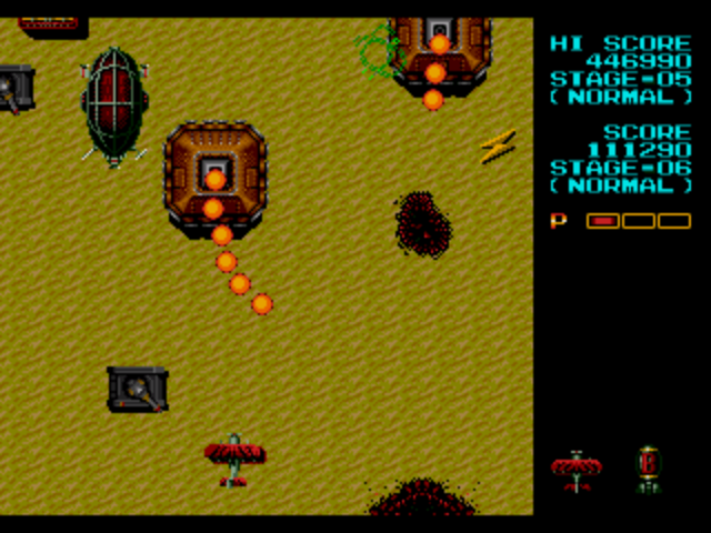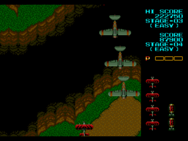 Like Twin Cobra, there are a few different versions of this game in the arcades. The initial Japanese release is only single player, and sends you back to a checkpoint if you die. Interestingly, if you take a hit, you can still moves around and shoot for a second while your plane flames out, though there’s nothing you can do to prevent your inevitable death. A revised two-player version removes the checkpoints, but also gets rid of these cool death scenes, so you explode immediately like every other shooter. The North American version is based on the two player release.