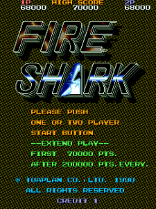 Fire Shark is the vastly improved sequel to Flying Shark. The most common complaint of Flying Shark was that your plane was too weak in its default state and takes too long to get powered up. This has been fixed, and then some. Taking a hint from Truxton, Fire Shark gives you a 3-way spread shot as your normal, weakest, attack. From there, your weapons get much stronger, so strong in fact, that it actually becomes somewhat unbalanced.