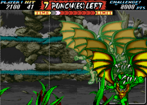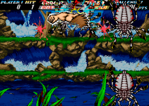 You play as Randy, some shirtless guy who may or may not live in prehistoric times. It’s not entirely clear. After Randy’s girlfriend Chris is captured by some kind of winged crocodile/dragon, Randy goes on a quest to rescue her. You’d think from the description that this will involve some kind of grand quest to get her back. Randy, however, decides to take the much more effective route of beating the crap out of everything until he gets her back. There’s four stages before you can save Chris, two of which put you against a shark, the other two against a crocodile. The crocodile stages take place on land, where you’ll beat the hell out of crocodiles and tribesmen, while the shark stages let you go berserk on fish and turtles with a machete. Besides the looks, all four stages are basically the exact same, and stages 3 and 4 are just palette swaps of 1 and 2.