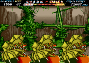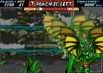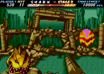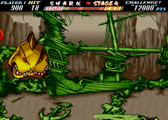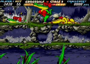 At the start of every level, you’re given a score quota you’ll be expected to meet. For the most part, the enemies that appear on screen will never hurt you, and the worst that’ll happen is that they’ll disappear before you can actually get a hit on them. Some enemies will also take multiple hits, or split into even more enemies you’ll have to bludgeon. Once the timer reaches the halfway mark, however, a midboss will show up. This will either be the winged reptile from the intro for the crocodile stages, or a giant fanged fish for the shark stages. Randy’s expression of utter terror when they appear should serve as a warning that these guys actually CAN kill you. You kill midbosses by getting a certain number of hits on them as they move across the screen. Get the hits in before time runs out, and you’ll blow the boss to pieces, along with getting some bonus points. If time runs out, however, they’ll take a bite out of Randy, and you’ll have to insert another credit to keep playing from where you died.