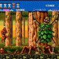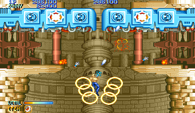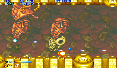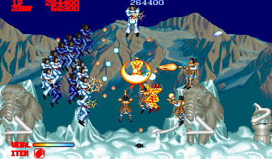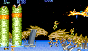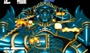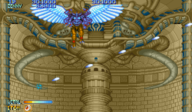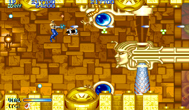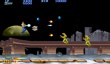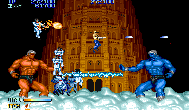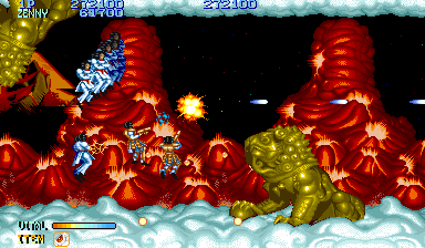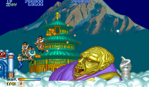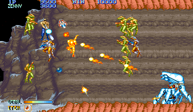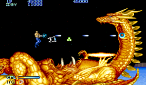 Shops were popular in Capcom arcade games, and Forgotten Worlds is no different. If you’ve saved up enough of the in-game currency, known as Zenny, you can expand your arsenal at the stores that burst through each stage’s terrain, brought to you by the game’s lady shopkeeper, Sylphie. Boosters for your satellite’s firepower, as well as weapon upgrades like the Vulcan Cannon and the Homing Laser, are here for the taking. Particularly powerful are the Flamethrower and Napalm which can quickly dispose of most end-stage heavies.