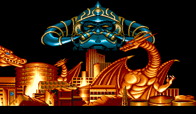 Speaking of which, one of the most fascinating aspects of Forgotten Worlds are indeed the game’s bosses. They constitute a who’s-who of worship figures. Everything from our current deities of technology and industrialization (symbolized by the techno-organic paramecium that spews industro-junk from its palpitating heart) to mythical entities such as fire breathing (Dust) dragons, to the Egyptian Sun God Ra, all become fair game for the Unknown Soldiers. This culminates in the final showdown with the fallen angel himself, Bios, the Luciferian King of Gods (who happens to be enthroned within the Tower of Babel no less).