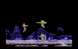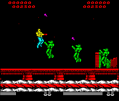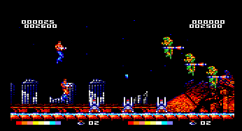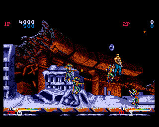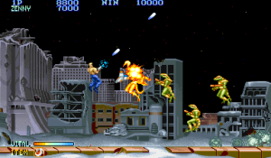 At least graphically. Because no sooner have the images started tickling your retinas, than a horde of flying lizardmen, flame spewing ball turret gunners, and holographic kabuki-men are besieging you in such monstrous waves that it’s nearly impossible to appreciate much, if anything, that’s on the screen. Your characters have a health bar, allowing you to take several hits, though only a single life per credit.