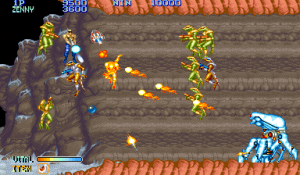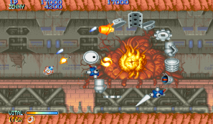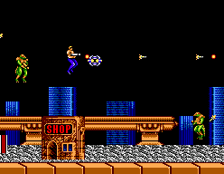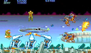 On consoles, the Genesis version from Sega is the most widely known. The A and C Buttons are used to rotate, while the B button is used to fire, with an option for an auto-fire setting. The characters are a little smaller and it’s missing some background details, but this is still the best looking console port. However, stages 6 and 8 are removed, for only seven levels total. Two player mode is kept but both player’s weapons are identical. This game is incompatible with the Genesis six button controller, so make sure to hold down the Mode button when booting it up, otherwise you’ll immediately be treated to a game over screen.