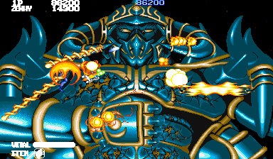 Each character’s default weaponry is slightly different – 1P has a long range rapid fire gun, while 2P has a short range wide shot. Both are equipped with a rapid-fire satellite similar to R-Type’s shooting orb. While the arcade cabinet’s joystick manages your directional movement, an accompanying rotary knob, called a rolling switch in Japan, does the real heavy lifting. Want to spin your character 360 degrees? Spin the cabinet’s rotary knob. Want to spin your satellite instead? Press down while spinning the knob. Feeling besieged? Press that knob down twice and annihilate your on-screen enemies in a blink.