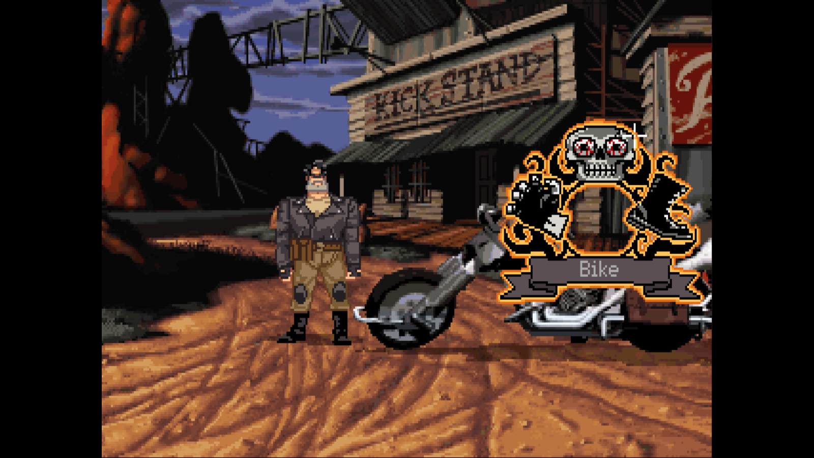 The world of Full Throttle seems to be expansive desert wasteland, filled with dilapidated businesses, scummy bars, and long, open roads. Cars seem powered by hover technology, but that’s the only hint of a futuristic setting. It might seem like a nightmare to a normal person, but it’s the way of life for the Polecats, a group of bikers in this quasi-apocalyptic landscape. Keeping up turbo powered, flame-exhaust-spewing motorcycles is a drain on the wallet, though, leaving the Polecats hard up for cash. They stop at a bar, and, in a stroke of what appears to be luck, they’re contracted as bodyguards for Malcolm Corley, president of Corley Motors, the last company in the country still producing the bikes they love. Despite being a bit old in the tooth, Malcolm is a lively gentleman, filled with stories from his younger glory days, and he’s heralded as something of a hero amongst all the biker gangs. Naturally, the Polecats are enthused.