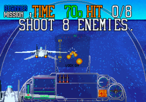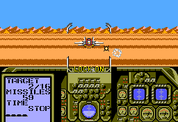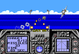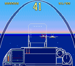 The viewpoint has been changed to a first-person cockpit view, although it zooms out whenever an enemy is on your tail. The game now focuses less on dodging enemy fire and more on shooting enemy planes that saunter up behind you. You have greater control over your plane’s rotation, so you can also fly completely upside down. There are also ground missions, where you fly low to the ground and dodge enemy fire as you blow up installations. There’s now a “damage” meter, so you can survive a bit of gunfire or bumps against other fighters, but getting hit by missiles or slamming into bad guys will still kill you instantly. At the end of the mission, you also need to land successfully on the aircraft carrier. Unfortunately, the game is much slower, both due to its rather lackadaisical pacing and sluggish controls. While the original After Burners were a little too insanely fast, G-LOC is more relaxed almost to the point of sedation.