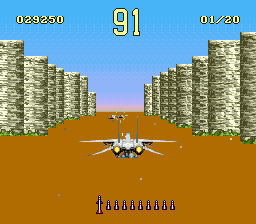 The Sega Master System version completely alters all of the levels. Half of the screen is taken up by a HUD and the landscapes are now rolling colors, but while the game looks worse than the SMS After Burner it plays a little bit better. In addition to the time limit, you can only die a certain number of times before needing to continue. Additionally, since the after burners are gone, the chase sequences – done in third-person like the Genesis version – are simple annoying sections where you need to dodge enemy fire for a certain period of time. Sega also added strange boss fights to certain stages. While the original After Burner titles have some grasp on reality, these bosses look like things you’d fight in an outerspace shoot-em-up and feel really out of place.