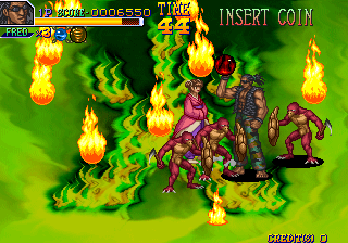 There are some interesting items as well, including two types of bombs, both of which detonate immediately once picked up. The first is an earthquake, which hits all enemies on screen for a large amount of damage, while the second is a random bomb, which sends out pillars of fire at random places, hitting any enemies that touch them. Both bombs can be very useful, especially if you’re out of magic. There are also explosive boxes that can be kicked at enemies to keep them away. One last notable item is the sword, which functions much like weapons that can be found on the ground in many other beat ’em ups.