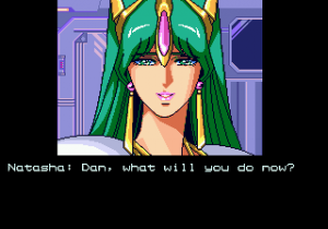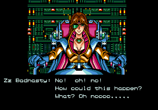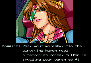 In some ways it’s also quite an odd shooter. Starting with the name, Gaiares, which isn’t obvious to pronounce. The Western promotional material even featured the slogan: Can you say “Guy-Are-Us”. Wikipedia incorrectly states this is a portmanteau of “Gaia Rescue”, but according to Kouji Yokota, it’s actually a case of reverse Engrish: it’s supposed to be “Gaia-less”, as in “without Gaia” or “Earthless”, since the planet had been ruined. The game also has an unprecedented ten minutes of anime cutscenes. There’s over seven minutes for the intro, and over two minutes for the ending, which is insane for a cartridge-based shooter in 1990. You control a pilot named Dan Dare (Dias in Japanese) as he fights a terrorist group named Gulfer. If they succeed, then humanity will be granted a new planet to inhabit. The TOZ is piloted by a woman named Alexis (Luanne), an alien from the Leezaluth Empire, who has brainwashed herself to fight alongside the humans. There’s also the Leezaluth queen Natasha (Ludianasa), who’s featured nude on the Japanese cover, as well as the evil queen Zz Badnasty (boringly called Zelduon in Japanese).