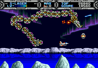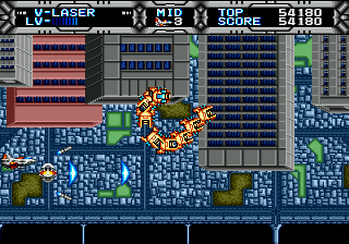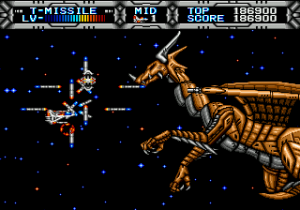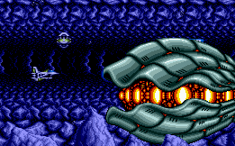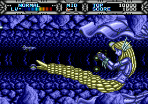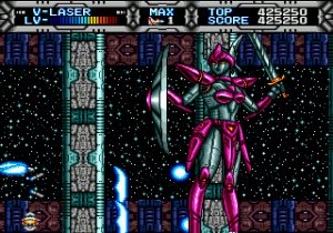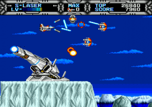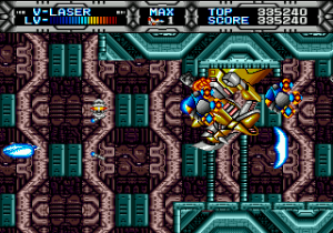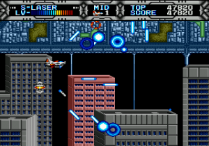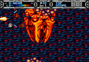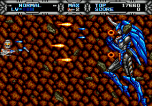 Perhaps the high difficulty was a blessing though. The game starts well, with hundreds of moving objects on screen, smooth vertical and horizontal multi-scrolling, parallax scrolling, lots of speed with seemingly no slowdown, massive bosses, rocking music, it hits all the right buttons. Until you reach the final two stages, where the game basically rehashes everything that’s come before to create a cheap and uninteresting boss rush.