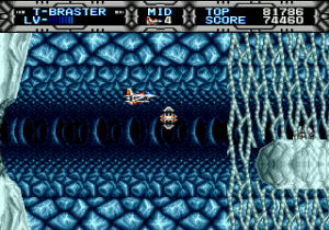 There’s a deliciously parasitic nature to the TOZ, sort of how H.R. Geiger’s facehuggers latch on to other life forms and adopt their characteristics for the resulting alien, so as to be optimally suited to that environment. The enemies are placed such that whatever weapon they have is usually pretty good for that situation. It’s an impressive invention for someone who’d previously mainly done pixel art. There are 13 different weapons to capture, plus the TOZ’s independently fired missiles, for a total of 14. Players finding the game too difficult can access a hidden and devastatingly powerful homing weapon, the T-Blaster, by firing the TOZ six times and missing, then capturing a weaponised enemy on the seventh attempt – firing from the screen’s rightmost edge makes this easier. (Be warned, it’s fairly useless for clearing a path through Stage 2’s ice network.)