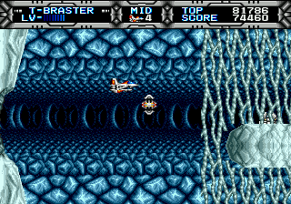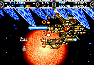 Mechanically Gaiares draws from Konami’s Gradius, with a diverse weapons system players can select at different times; Irem’s R-Type, by having an always present Option module that acts as both weapon and partial shield; and maybe a tiny bit of Taito’s Darius in terms of branching paths and one notable aquatic boss, and maybe Technosoft’s Thunder Force series too. It also liberally borrows stage themes from all of them, including blasting a path through obstructing scenery and penetrating the bay doors of giant spaceships. The branching paths are also subtly implemented, requiring only that you move to the top of bottom of the screen, and make replays less tiresome. For example on Stage 1, before the mid-boss, you travel along the top of a foliage covered asteroid, taking out ground targets, or fly beneath it while avoiding falling debris. The same occurs in the castle stage, and the space station; different paths resulting in different scenery, enemies, and environmental dangers.